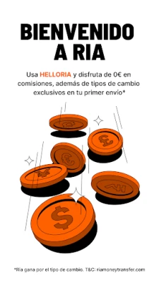 Con Ria Money Transfer, enviar dinero a tus seres queridos en cualquier parte del mundo es fácil y seguro. Descubre tarifas exclusivas y aprovecha la comisión de 0€ en tu primera transferencia usando el código Helloria. Es tu solución confiable para enviar dinero internacionalmente, conectándote con tu familia y amigos.
