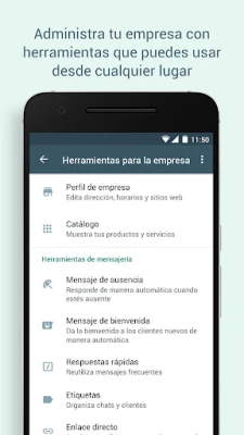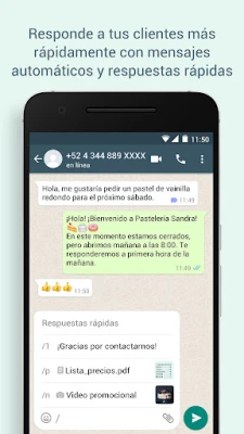 Descubre funcionalidades exclusivas pensadas para la esfera empresarial. Configura un perfil de negocio completo donde tus clientes encontrarán de forma ágil datos cruciales como tu ubicación, sitio web y otros métodos de contacto. Gestiona tus comunicaciones con inteligencia usando herramientas de mensajería automatizada: envía un cordial mensaje de bienvenida a quienes te escriben por primera vez, o programa respuestas de ausencia para cuando no estés disponible, asegurando que tu negocio siempre esté en contacto. Además, ofrece la conveniencia de recibir mensajes en tu número de teléfono fijo, validando tu cuenta con una simple llamada.